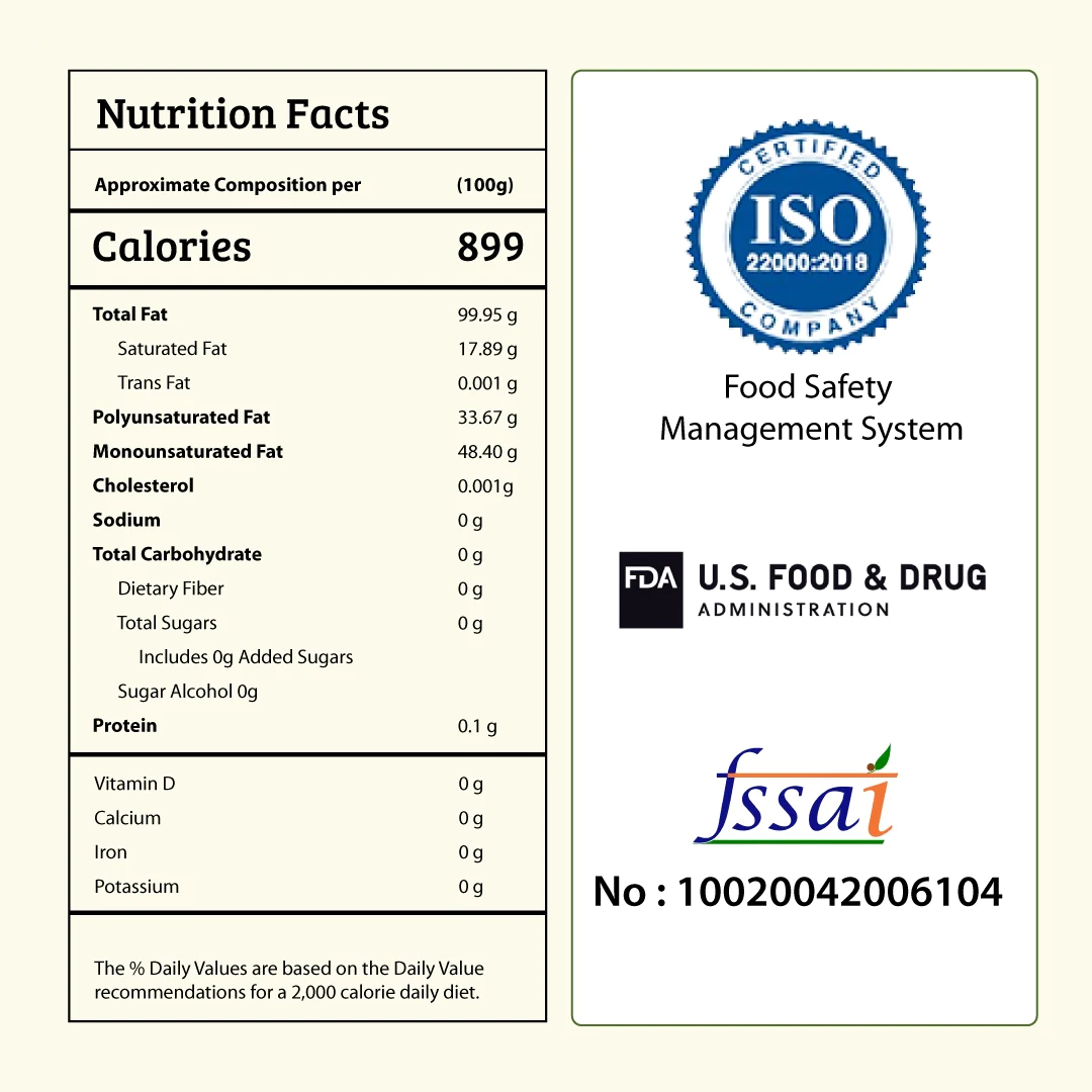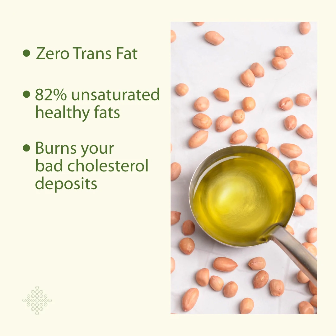 Get the goodness of healthy fats, while having zero trans-fats (bad cholesterol) with our wood pressed groundnut oil extracted at temperatures less than 50°C.