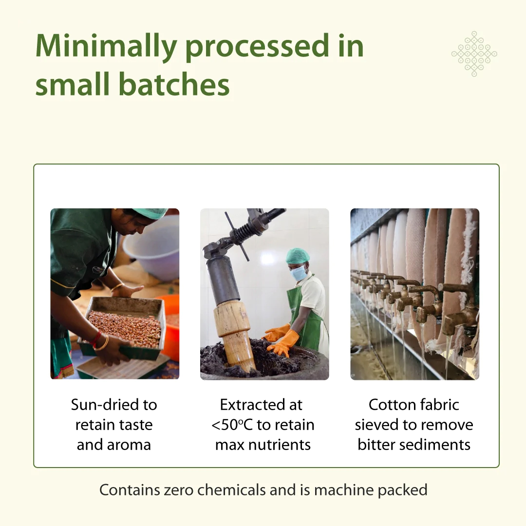 Our cold pressed groundnut oil is passed through multiple layers of cotton fabric to remove the bitter and splattering sediments that are usually found in cold pressed groundnut oil.